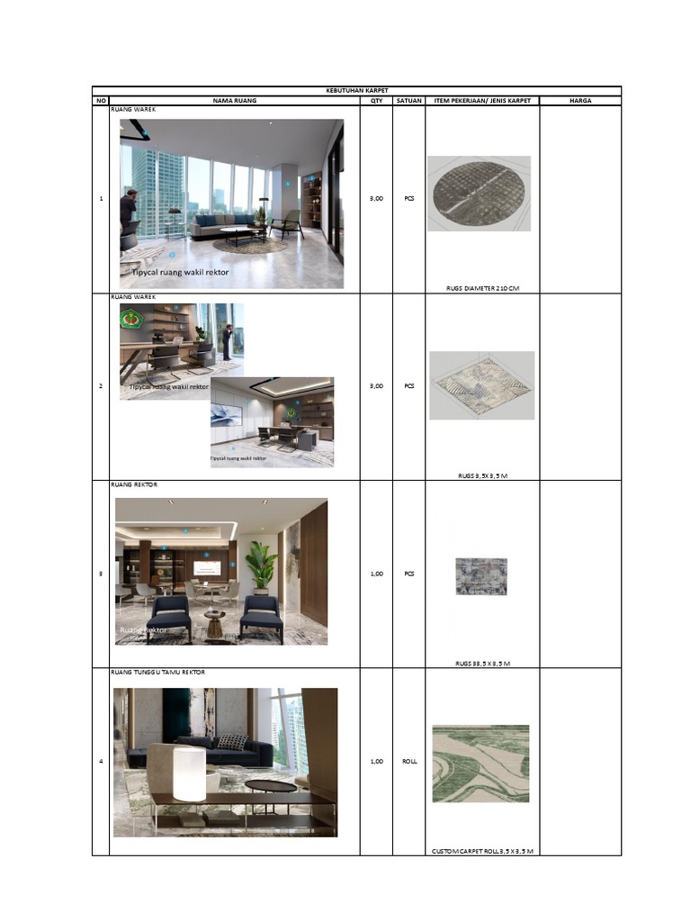 Carpet Requirements for Various Rooms at a University Including Sizes