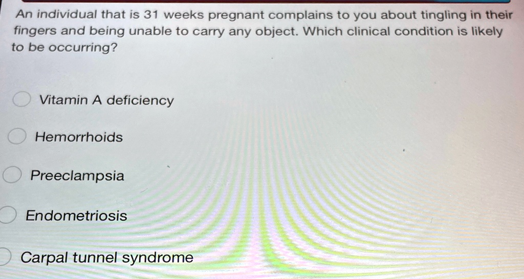 an individual that is 31 weeks pregnant complains to you about tingling