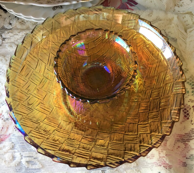 Chip and Dip Basket Etsy Carnival Glass Chip And Dip Bowl Indiana carnival glass chip and dip bowl golden tone 3 piece chip & dip set. Brilliant carnival glass in a basket weave pattern. Vintage indiana glass carnival glass chip and dip set. We have a great online selection at the lowest prices with fast & free shipping on. Large bowl is 9 across rim and 3 tall. Vintage mccoy amber. Carnival Glass Chip And Dip Bowl.