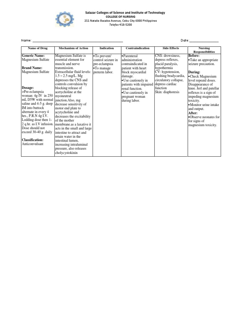 SOLUTION Drug study magnesium sulfate docx Studypool Magnesium Sulfate Pharmacological Class Medically reviewed by drugs.com on sep 10, 2024. It is also used for pediatric acute. Magnesium is an important cofactor for enzymatic reactions and plays an important role in neurochemical transmission. Magnesium sulfate is an important medication with a variety of clinical applications, supported by its unique pharmacological properties. Magnesium sulfate is a medication used to manage and treat multiple. Magnesium Sulfate Pharmacological Class.