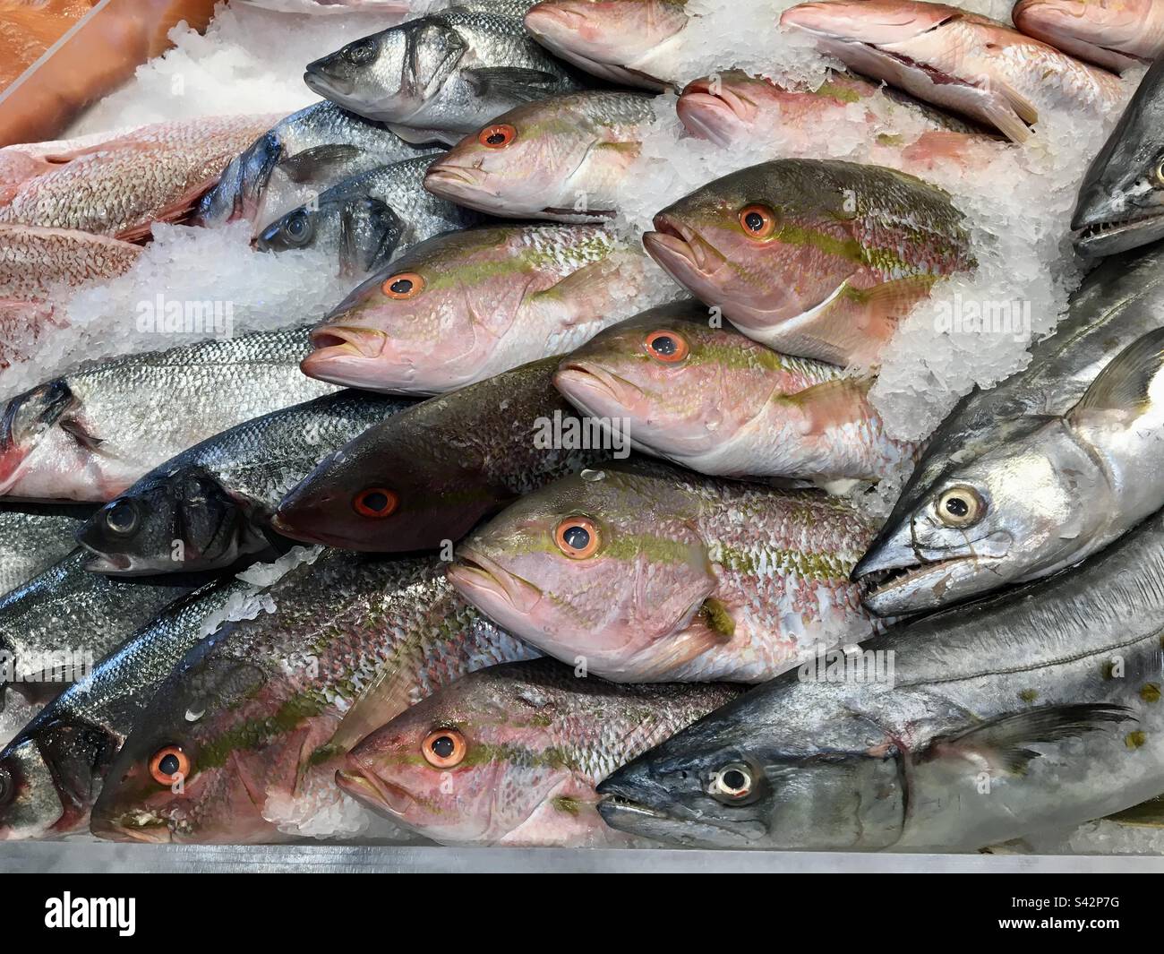 Frozen fish on ice in a grocery store Stock Photo Alamy
