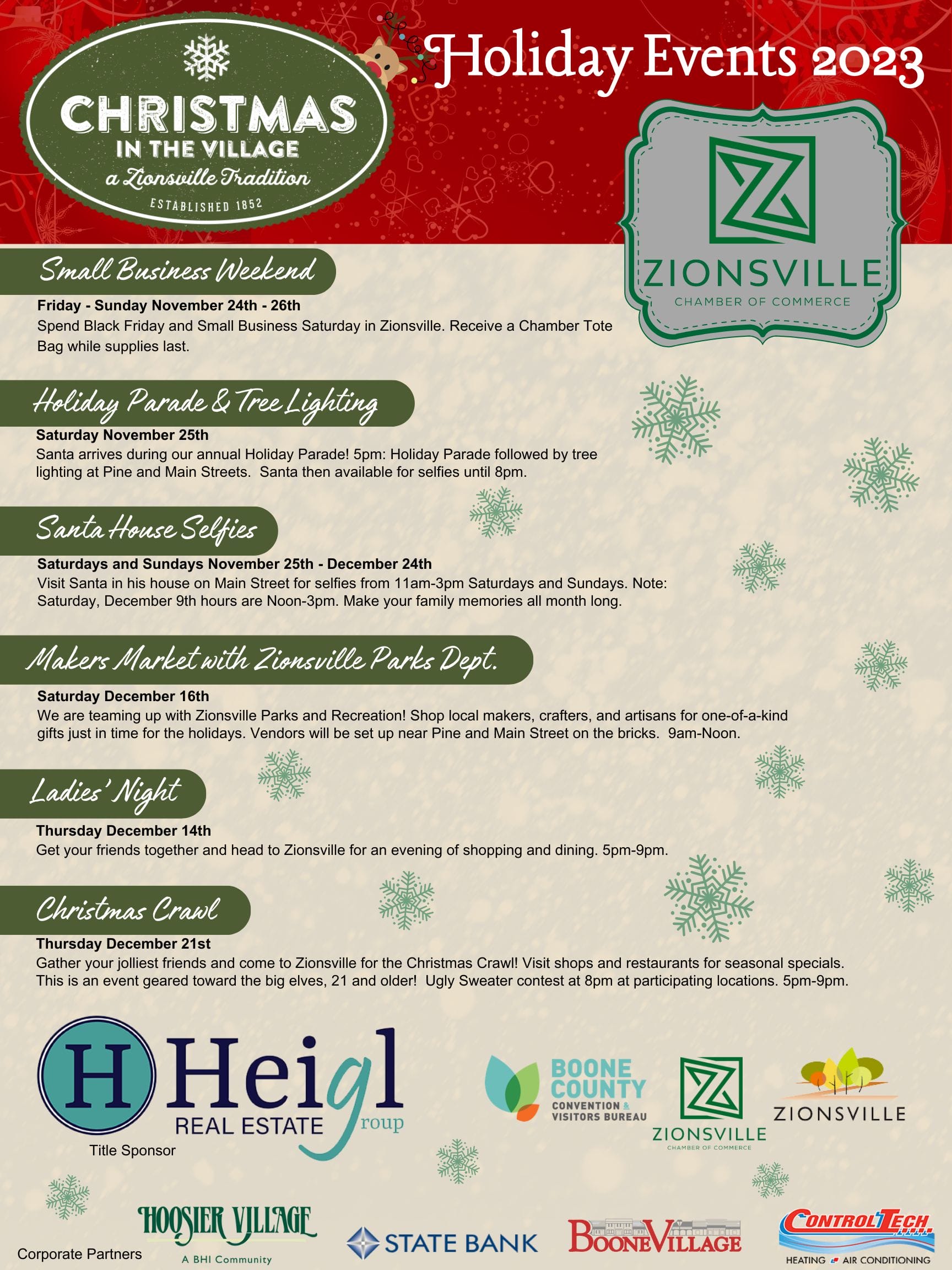 The Christmas Crawlpresented by Cobblestone of Zionsville Zionsville Zionsville Christmas Village Zionsville is ushering in the holiday season with an array of events through the end of the year, beginning with christmas in the village, a tradition in zionsville that runs nov. Stay for the town tree lighting on the corner of pine and main. Shop and dine in the village until the streets close at 4 pm and the parade. Zionsville Christmas Village.