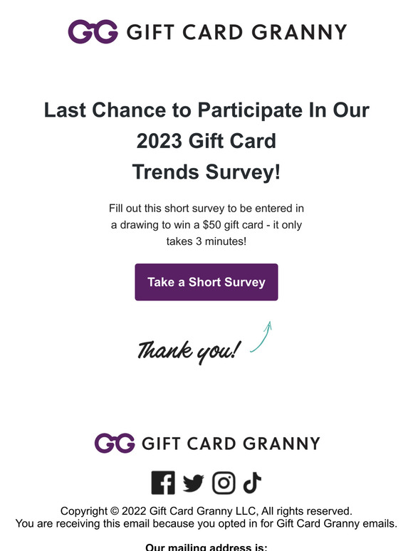 Gift Card Granny Last chance to enter for a chance to win a 50 gift card. Milled