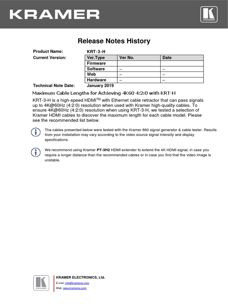 Release Notes History Maximum Cable Lengths For Achieving 4K60 420 With KRTH PDF Hdmi