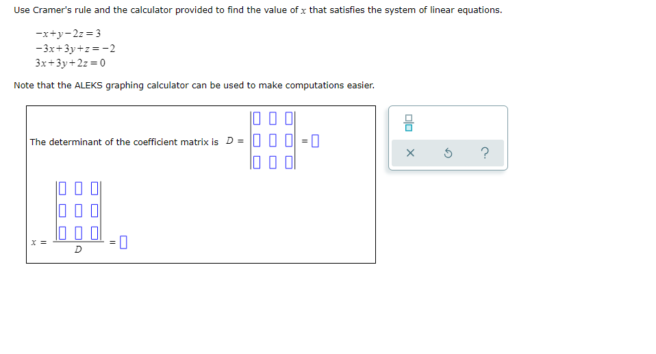 Solved Use Cramer's rule and the calculator provided to find Cramer's Rule Calculator X Y Z First, click on one of the buttons below to. Solve the system of linear equations using cramer's rule step by step. This calculator will solve the system of linear equations of any. Calculate 3×3 system using cramer’s rule. To find the 'i'th solution of the system of linear equations using cramer's rule replace the. Enter the coefficients of x, y,. Cramer's Rule Calculator X Y Z.