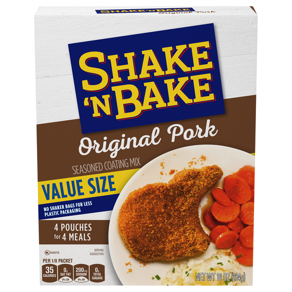 Save on Shake 'N Bake Original Pork Seasoned Coating Mix Value Size 4 ct Order Online Delivery Shake 'N Bake Original Pork Seasoned Coating Mix Let chops stand 3 min. Shake up dinnertime with a family favorite. Featuring a blend of herbs, spices and bread crumbs, our seasoned coating mix creates crispy, flavorful and juicy pork without frying. One 5 oz box containing 2 packets of shake 'n bake original pork seasoned coating mix. Shake 'n bake, original pork seasoned coating mix, 5 oz. Featuring. Shake 'N Bake Original Pork Seasoned Coating Mix.