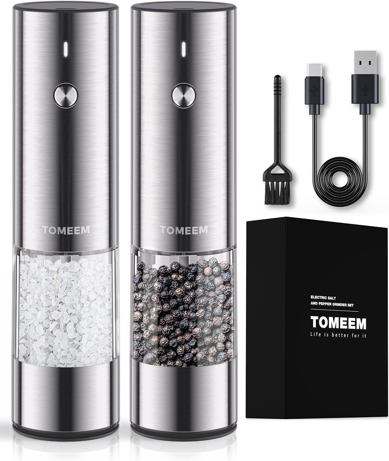 TOMEEM Electric Salt & Pepper Grinder Set, Stainless Steel, One Hand Tomeem Electric Salt And Pepper Grinder Set Tomeem is renowned for its thoughtfully designed electric salt and pepper grinders, focusing on combining advanced technology with elegant. Tomeem rechargeable salt and pepper grinder set including black pepper, white pepper, salt, himalayan salt, red pepper flakes, rosemary, anise seeds, flax seeds, and cumin seeds. Tomeem 1.6oz automatic salt and pepper grinder, a sleek and modern addition to any kitchen.. Tomeem Electric Salt And Pepper Grinder Set.