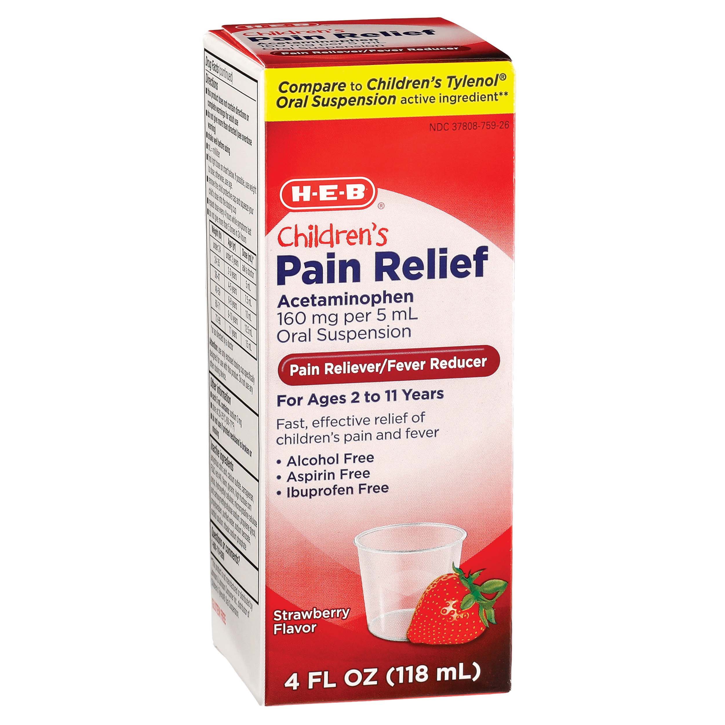 HEB Children's Pain Relief Acetaminophen Suspension Strawberry Liquid Generic Children's Acetaminophen How does this medication work? The tables* below can help you. What will it do for me? Acetaminophen (tylenol, others) has long been used to lower fever and ease pain in children. Children younger than 12 years old: Giving the wrong amount, or dose, of medicine is one of the biggest problems parents have when giving acetaminophen to children. It's. Generic Children's Acetaminophen.
