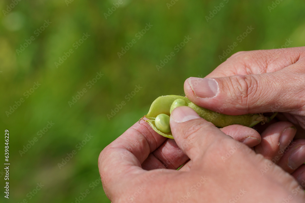 Growing green peas. Farmer's hand with a pea pod closeup. Ecofriendly