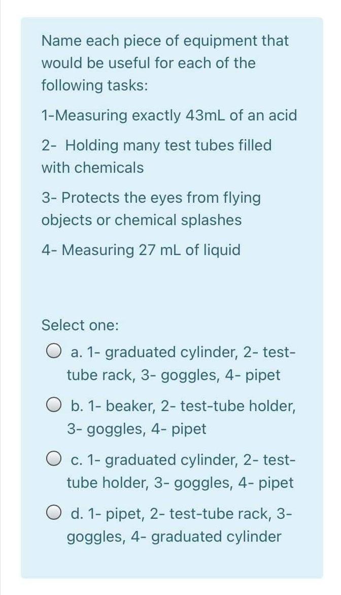 Solved Name each piece of equipment that would be useful for Measuring Exactly 43Ml Of Water We will analyze the pros. The correct lab equipment for each task is listed above. 2 match the equipment to the. Biuret is a long glass tube with calibration and with a tap at its end. It is usually used during acid base titration. Measuring exactly 43ml of an acid (rtube) ________________ massing out 120 g of sodium chloride (acbnela). Measuring Exactly 43Ml Of Water.