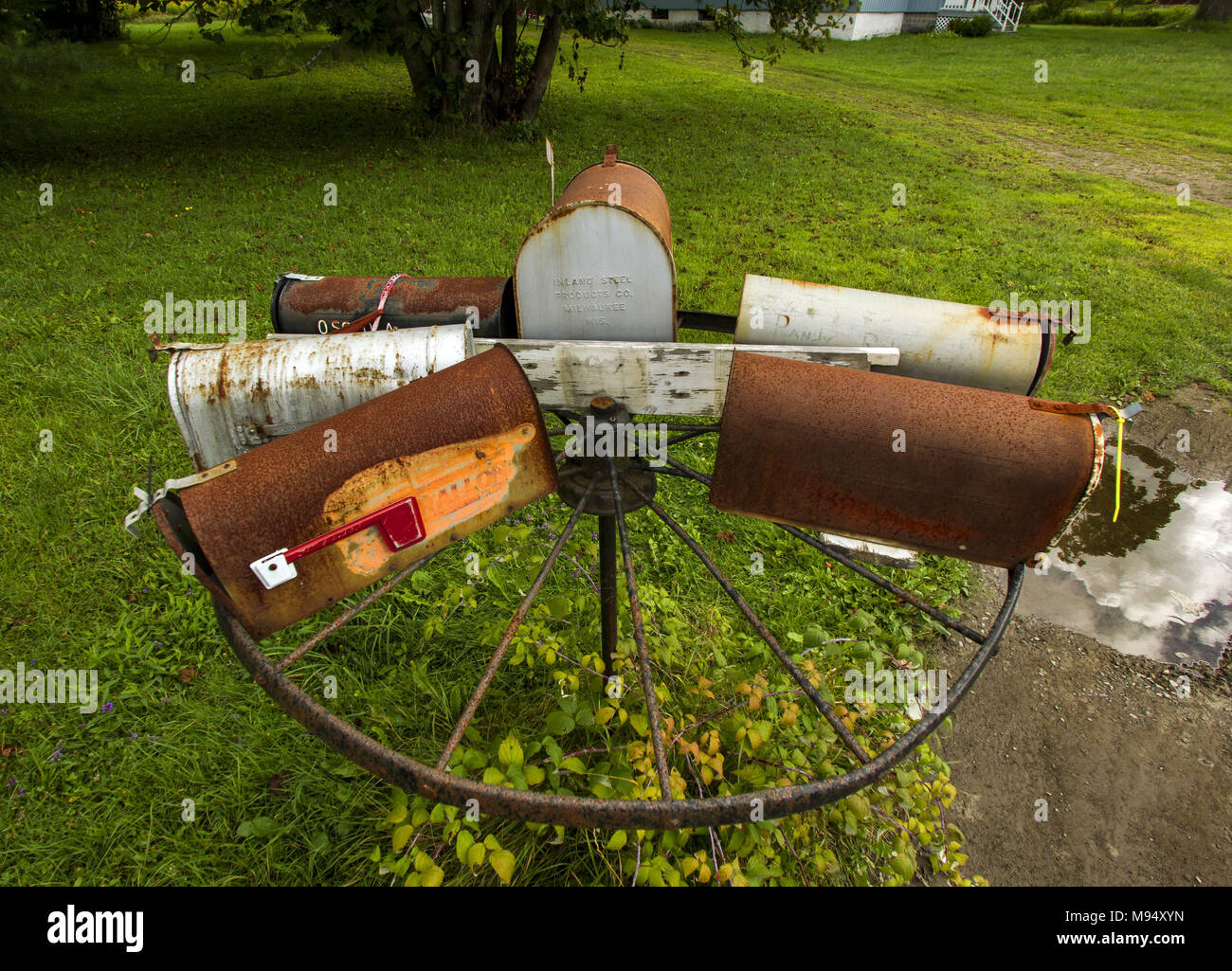 Boonville, New York, USA. 25th Aug, 2015. Mailboxes are mounted on an old wagon wheel about