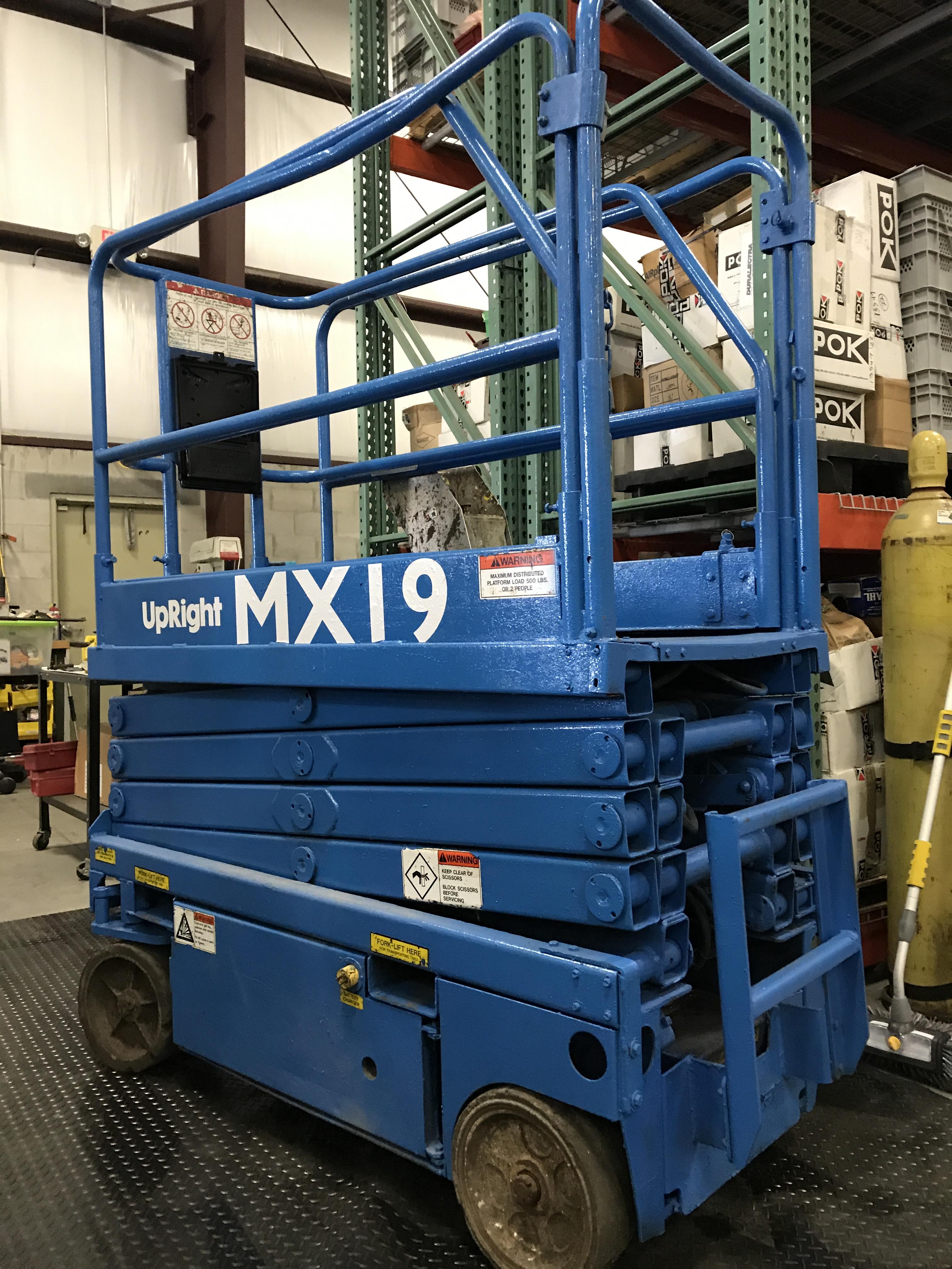 MX19 UPRIGHT SCISSOR LIFT W/ BUILT IN BATTERY CHARGER, RUNS AND