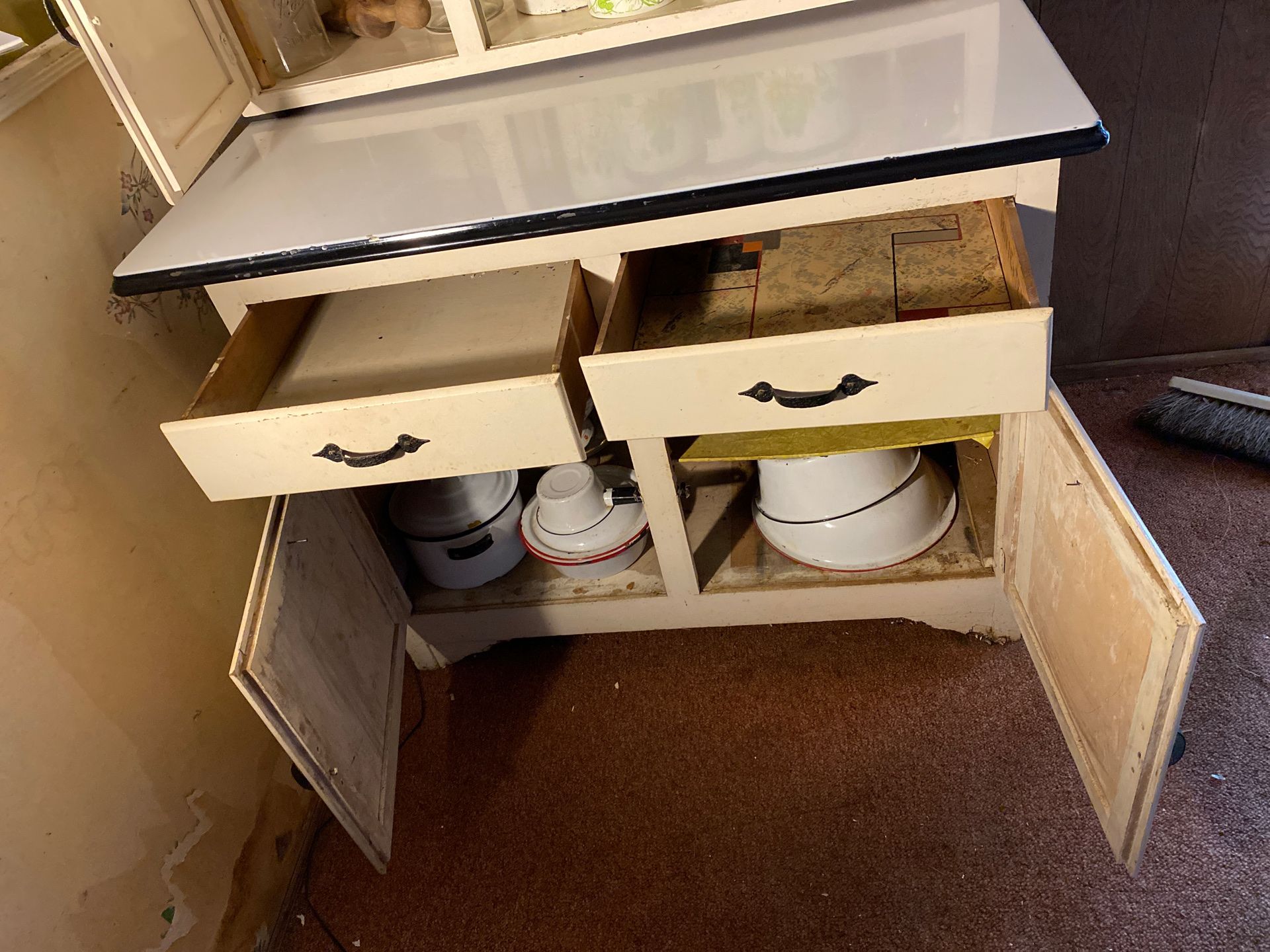 Antique Hoosier with metal enameled pull out table roll door