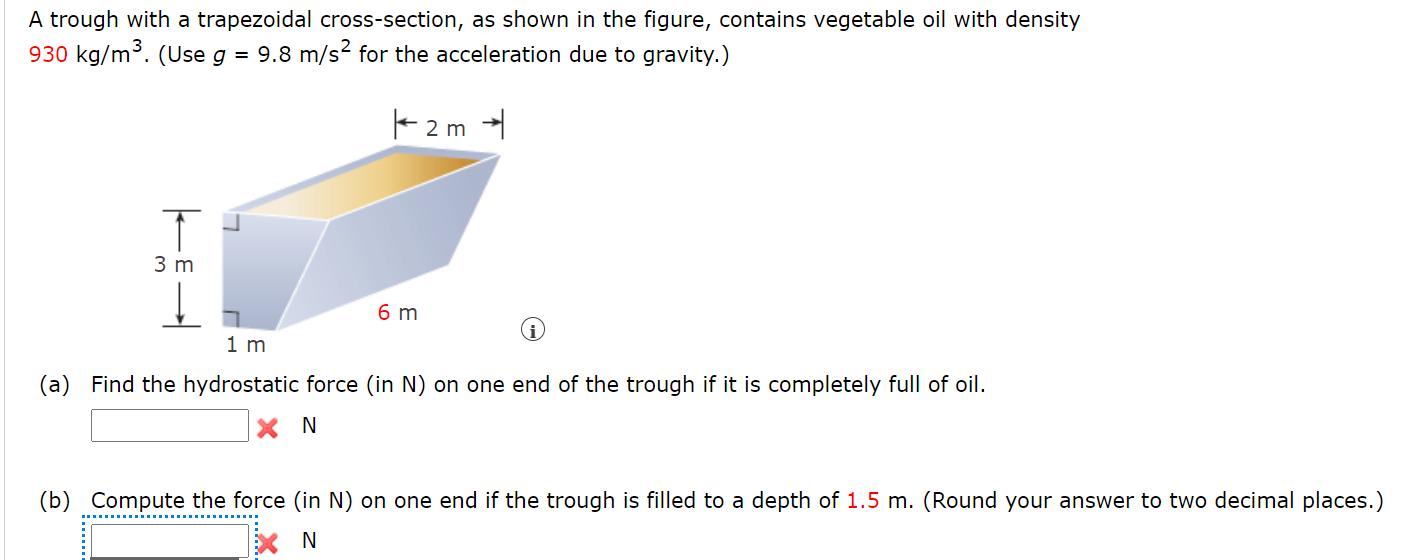 Solved A trough with a trapezoidal crosssection, as shown Vegetable Oil Density Kg/M3 A generalized method was developed to estimate the liquid density of vegetable oils and fatty acids. The density of the oils varies with each type and temperature. Volumetric mass density of cooking oil (food) in other popular units: The correlation for vegetable oils was based on fatty acid critical properties and composition of the oil. In order to predict the. Vegetable Oil Density Kg/M3.