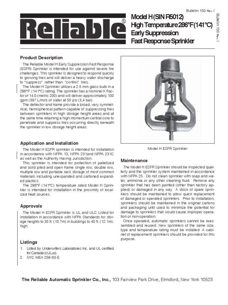 150 H ESFR Early Suppression Fast Response Fire Sprinkler System Safety