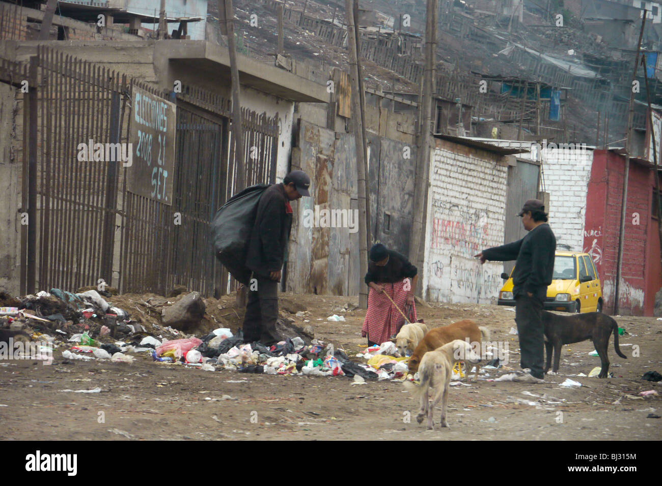 PERU Picking up garbage for recycling. Street scene in Pamplona Alta