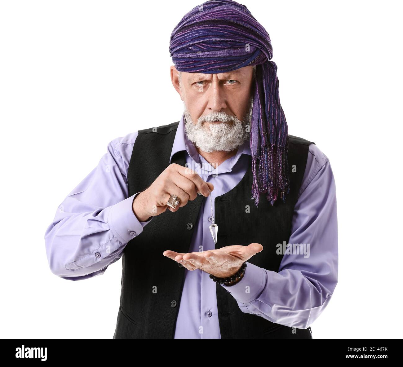 Male fortune teller with pendulum on white background Stock Photo Alamy