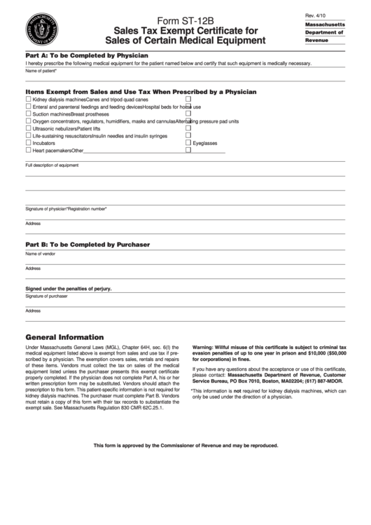 Form St12b Sales Tax Exempt Certificate For Sales Of Certain Medical Massachusetts Sales Tax Exempt Items While the massachusetts sales tax of 6.25%. what purchases are exempt from the massachusetts sales tax? generally, food products people commonly think of as groceries are exempt from the sales tax, except if they are sold. several examples of exceptions to this tax are most food and grocery products (not food served at a restaurant), certain sanitation.. Massachusetts Sales Tax Exempt Items.