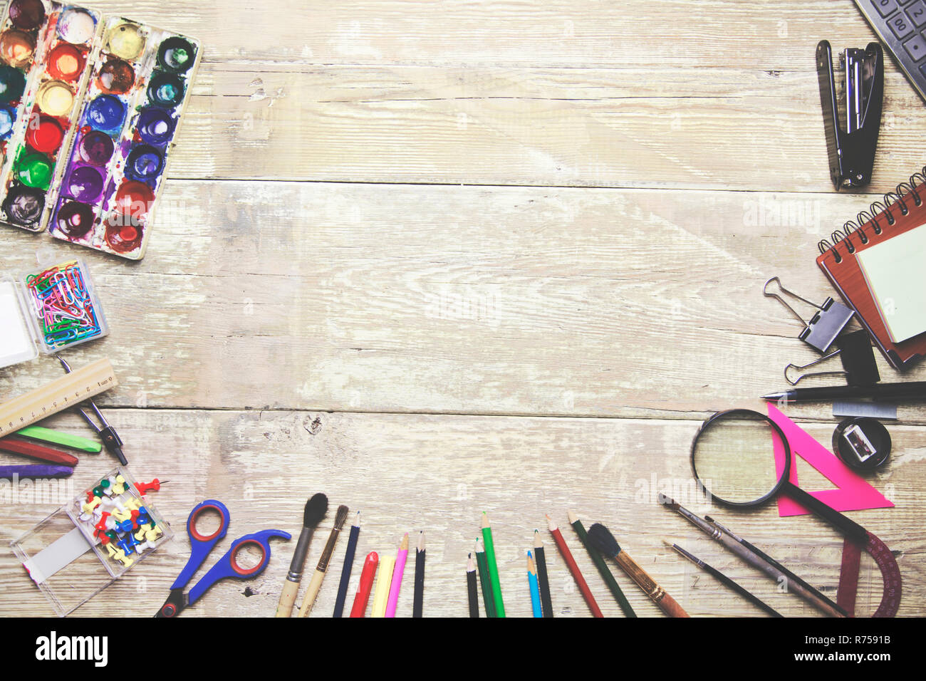 School and office supplies on wood background Stock Photo Alamy