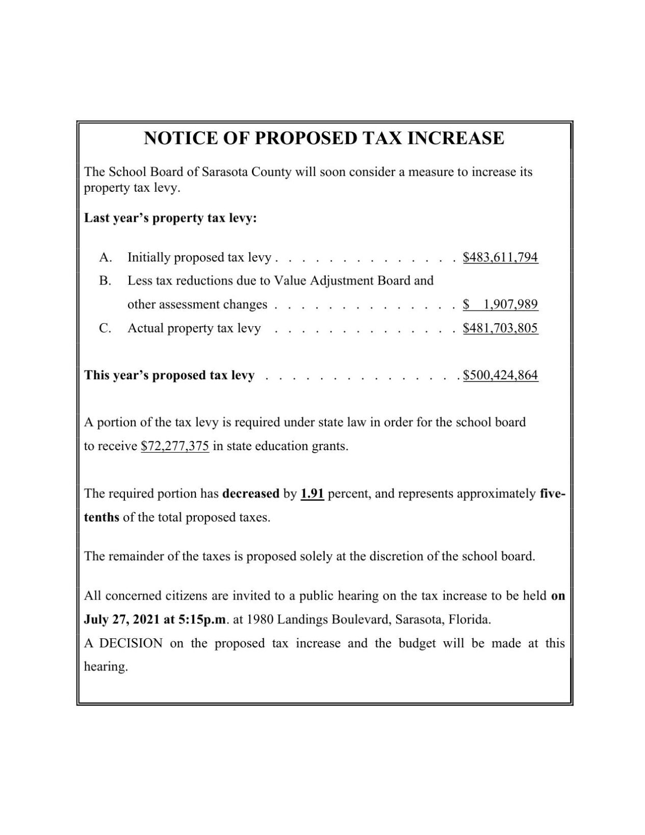 Sarasota School Board tax levy