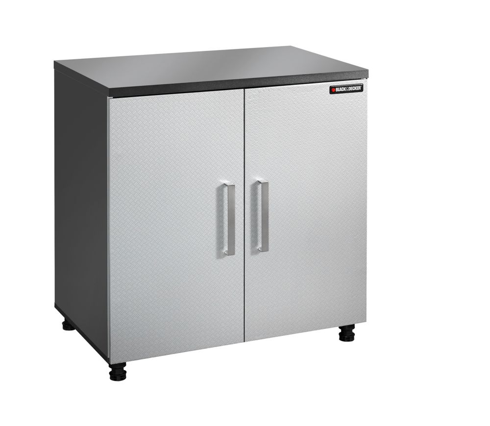 With sturdy design and heavy duty features this garage series has a wider variety of applications from garages and workshops to utility rooms and basements. This cabinet also features charcoal stipple. Black & decker 2 door storage cabinet includes 3 adjustable and 2 fixed shelves as well as leg levellers for uneven surfaces. Model # bs105771hh store sku # 1000753656. The black & decker 2 door cabinet with 1 fixed shelf and 1 open shelf includes doors featuring large metal handles and european hinges.