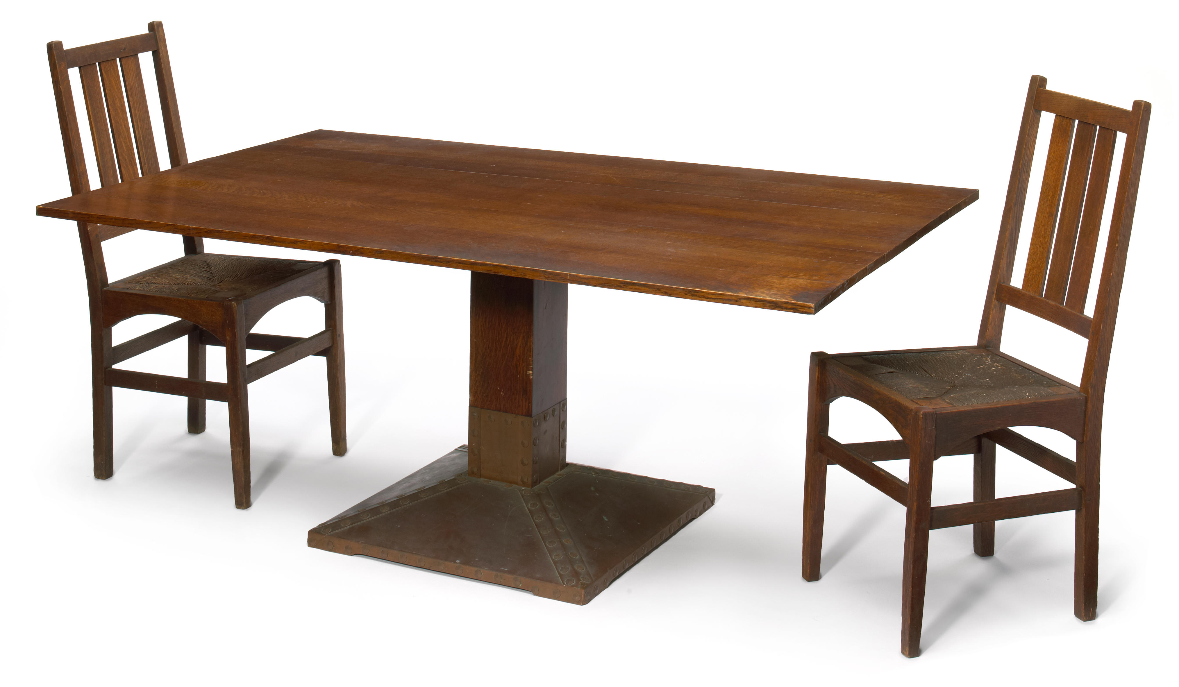 An Arts & Crafts oak and copper dining table and six Gustav Stickley