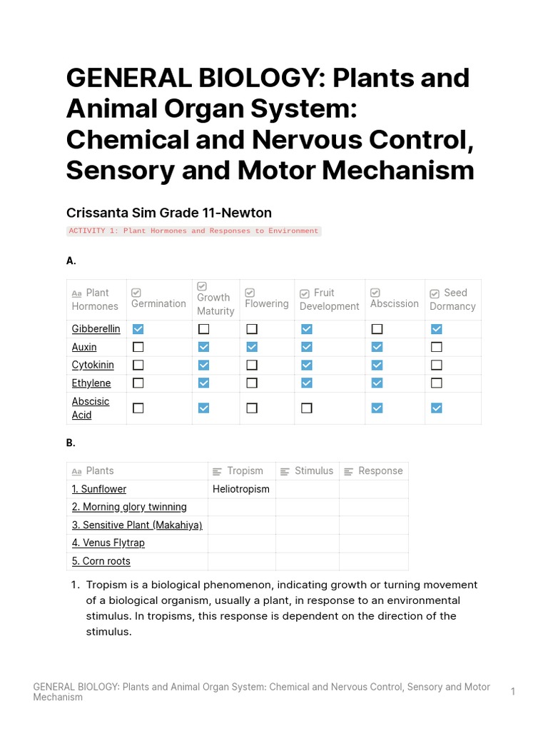 GENERAL BIOLOGY Plants and Animal Organ System Chemical and Nervous
