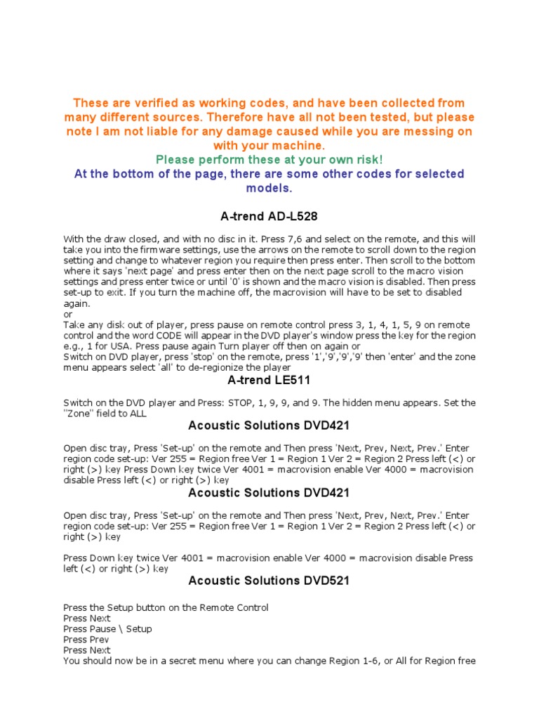 Region free dvd player codes comelasopa Dvd Player Codes By keith vetter / july 26, 2019. A sony dvd player can be controlled with any universal remote if you have the correct programming guide and the correct remote codes for the dvd player. If you have a sony dvd player and want to control it with a universal remote control, we have the codes needed. 3 digit universal. Dvd Player Codes.