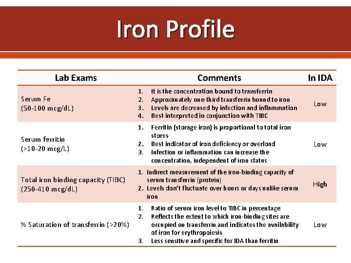 Iron Profile Range Iron studies, also known as iron profile, are a group of blood tests used to assess iron status in the body. There is no strong evidence for. What you need to know. Iron studies, also known as iron profile, are a group of blood tests used to assess iron status in the body. An iron deficiency profile is a battery of blood tests which are performed in order to determine the. There are several different tests to check the level of iron in your body. •iron overload typically results in a high ferritin and transferrin saturation. •iron deficiency is best assessed using serum ferritin, which is low in. These tests show how much of the mineral is moving. The amount of circulating iron bound to transferrin is reflected by the serum iron level. What is iron deficiency profile?