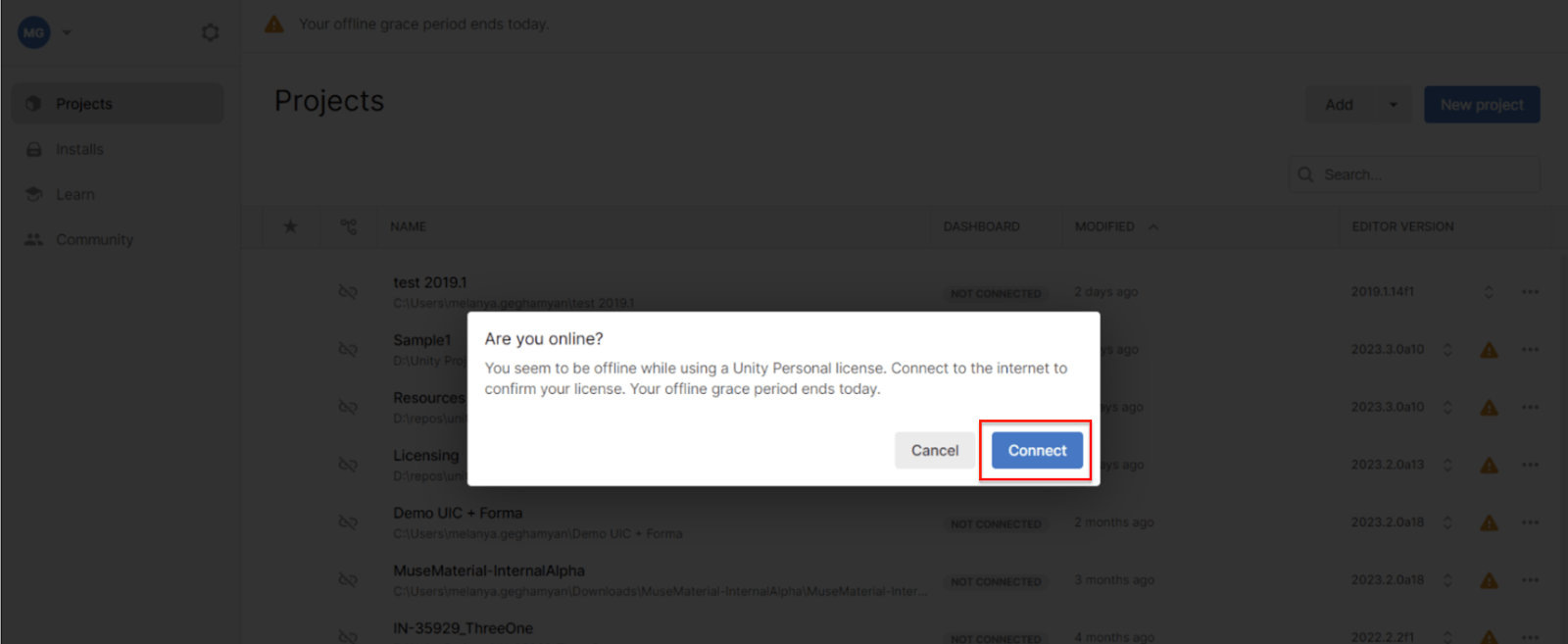 I see the error ‘You seem to be offline while using a Unity Personal