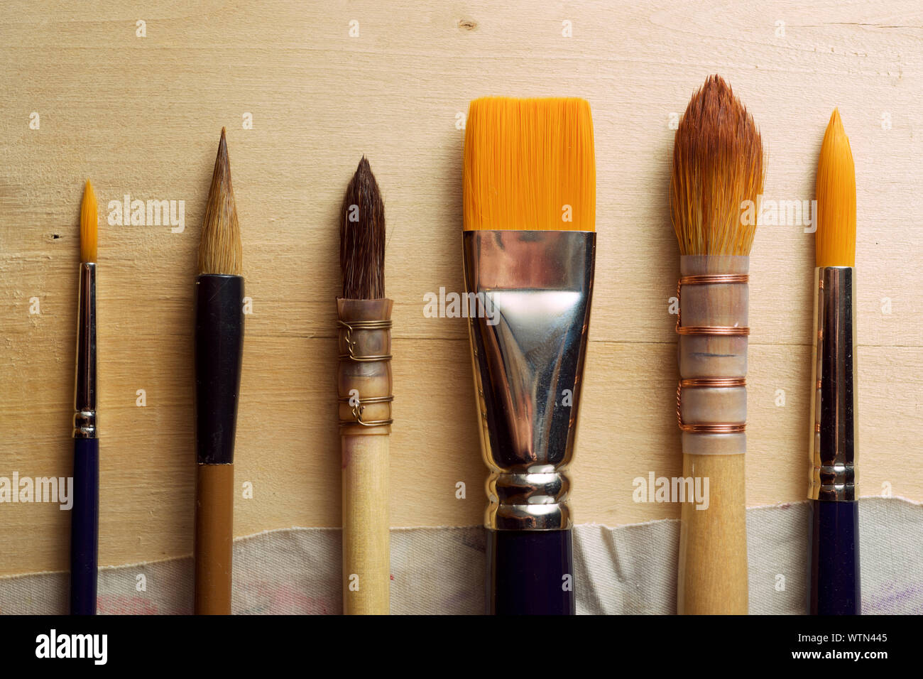Paintbrushes on a wood table Stock Photo Alamy