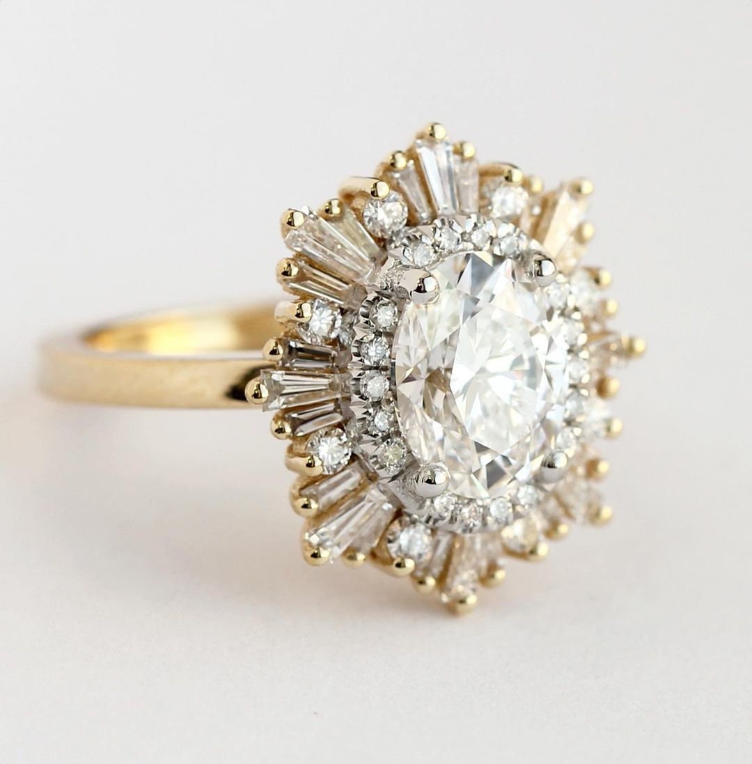 14k gold wedding ring starburst halo oval moissanite Etsy
