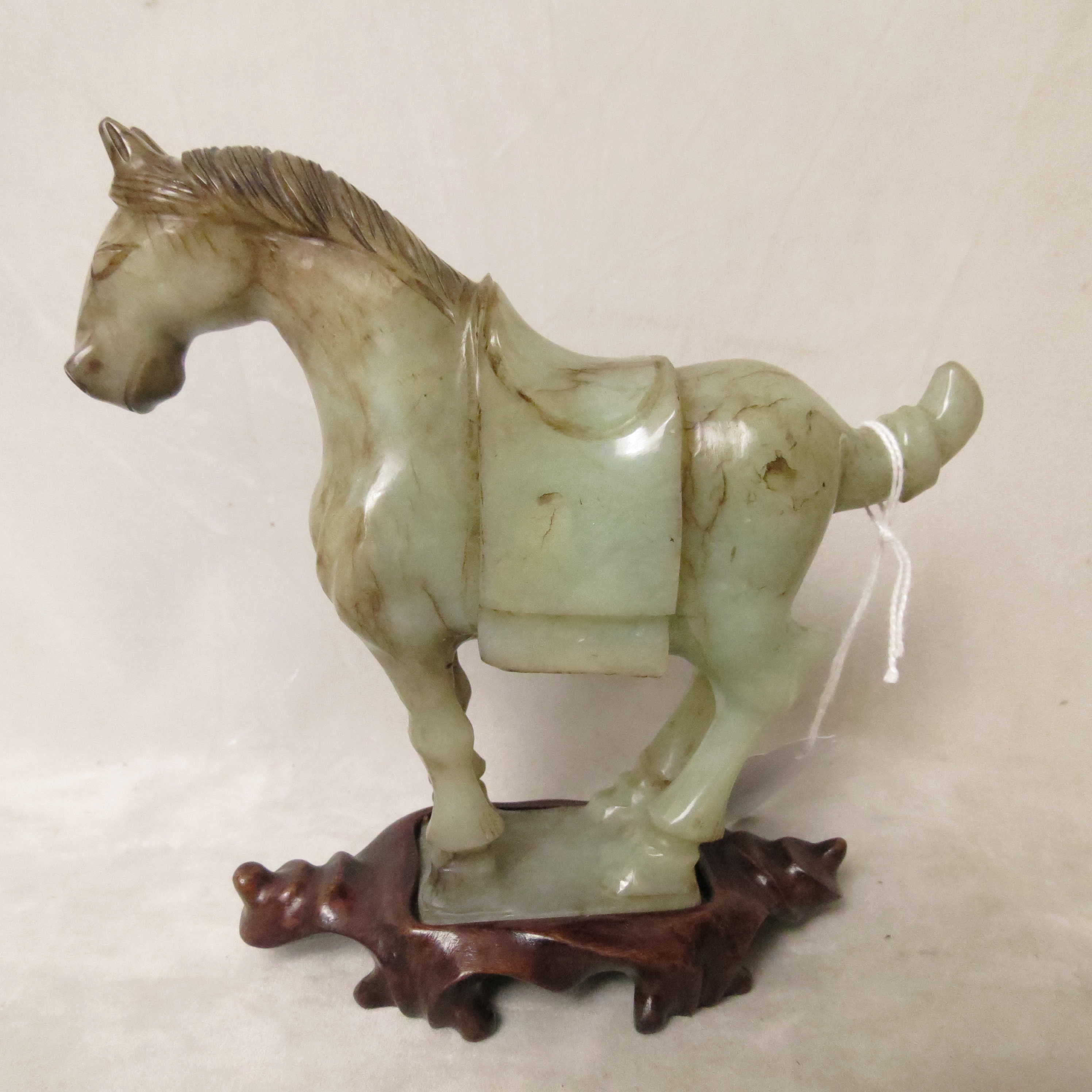 A Chinese jade sculpture of a Tang dynasty horse with dark brown to
