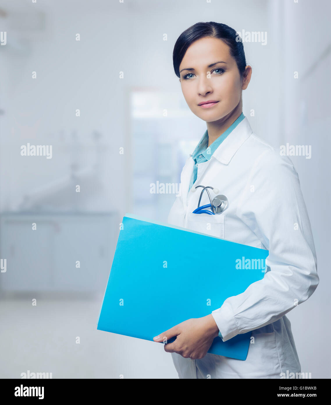 Smiling young female doctor holding medical records file Stock Photo