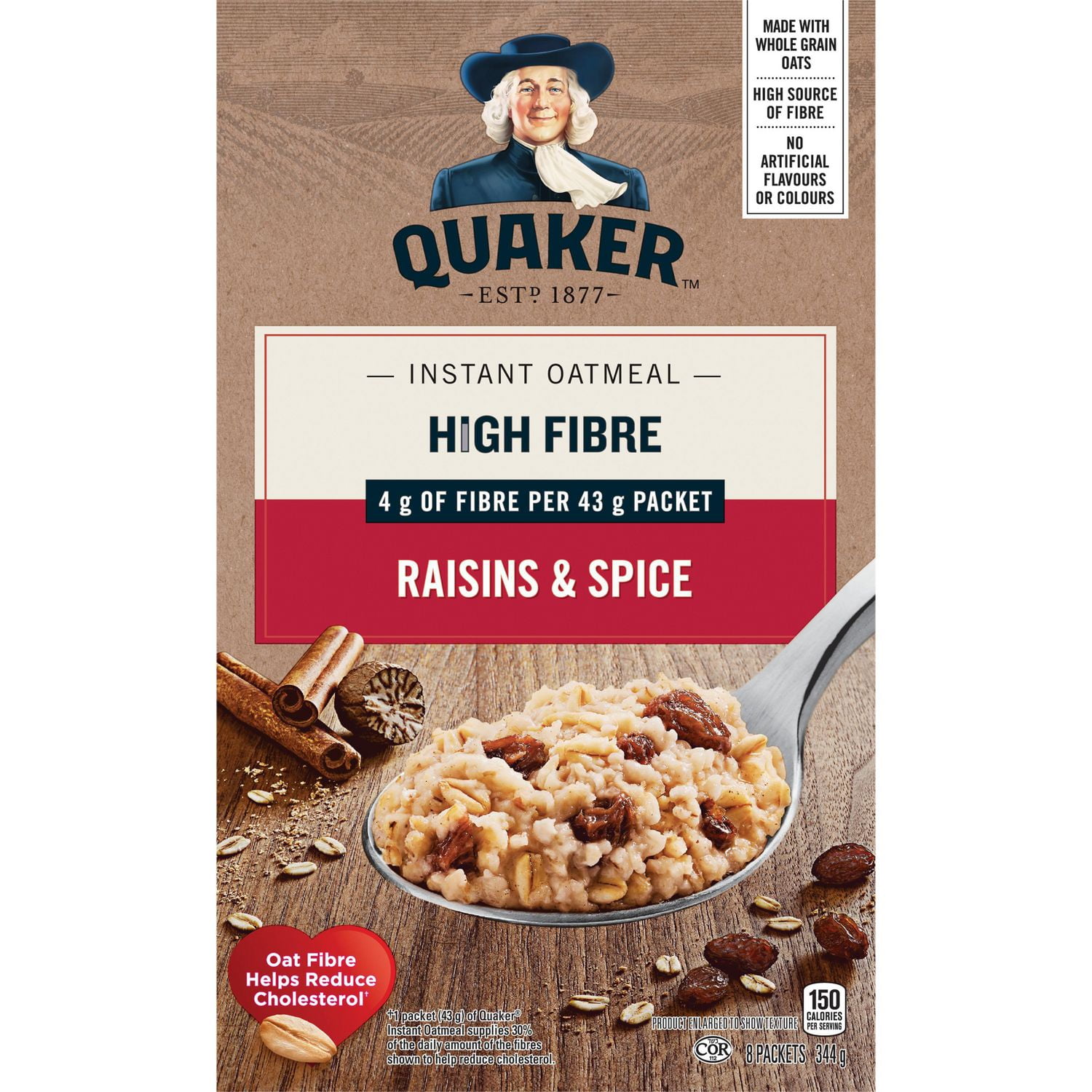 There are 150 calories in 1 packet (43 g) of quaker instant oatmeal high fibre raisins & spice. The macronutrient breakdown is 79% carbs, 11% fat, and 10%. Raisins and spice quaker® instant oatmeal are made with delicious grains you'll love. Calories and other nutrition information for instant oatmeal, raisins & spice from quaker 1 packet of raisins & spice instant oatmeal (quaker) contains 150 calories. 1 serving of raisins and spice instant oatmeal (quaker) contains 150 calories. 1 packet of instant oatmeal, raisins & spice (instant, raisins & spice, quaker) contains 160 calories. 9% fat, 84% carbs, 8% prot. The macronutrient breakdown is 81% carbs, 11% fat, and 7%. Find nutritional information, offers, promotions,.