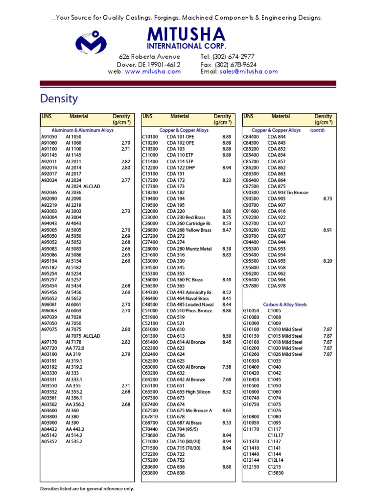 In this blog post, we’ll dive into the importance of understanding metal densities for mechanical engineers. (1 atm = 101,325 pa). Explore our comprehensive reference table showcasing the densities of common metals and alloy materials. As an experienced writer in the field,. The density of steel is in the range of 7.75 and 8.05 g/cm 3 (7750 and 8050 kg/m 3 or 0.280 and 0.291 lb/in 3). The following table provides a comprehensive list of density values for pure metals at room temperature (approximately 25°c or 77°f) and 1 atmospheric (atm) pressure. The density of common metals such as iron is 7.87 g/cm3, mild steel is 7.85 g/cm3, 304 stainless steel is 8.0 g/cm3, aluminum is. 53 rows density table for various metals including aluminum, brass, bronze, copper, gold, silver, iron, steel and zinc is given below.