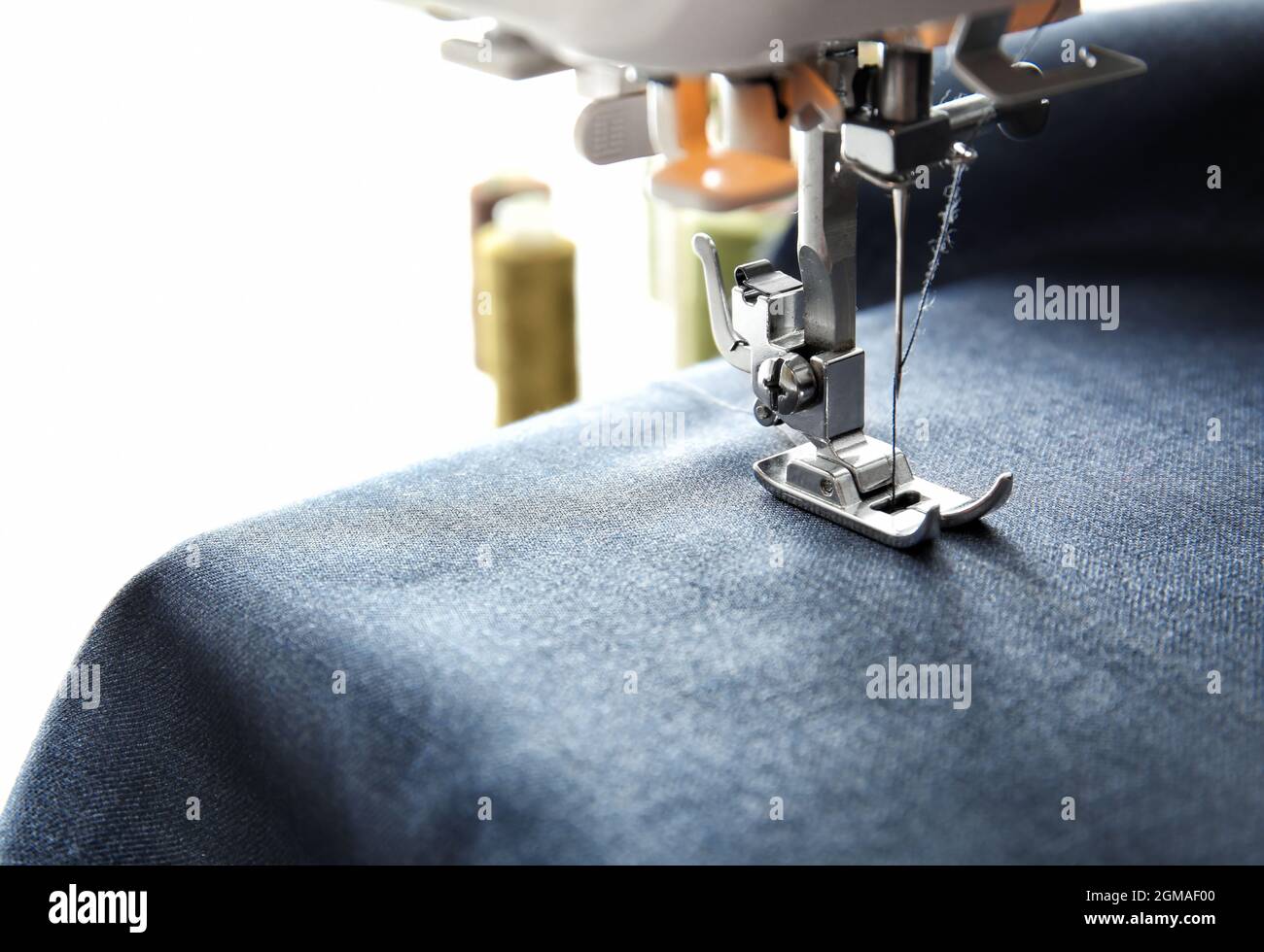 Modern sewing machine with fabric and thread, closeup Stock Photo Alamy