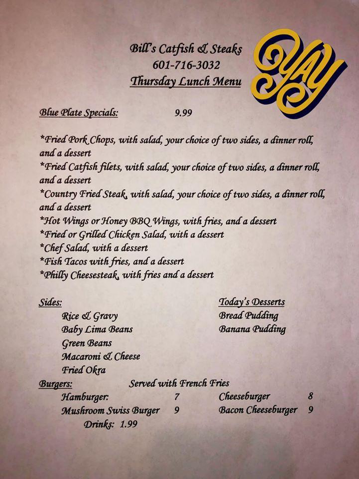 Menu at Bill's Catfish & Steaks steakhouse, Wiggins