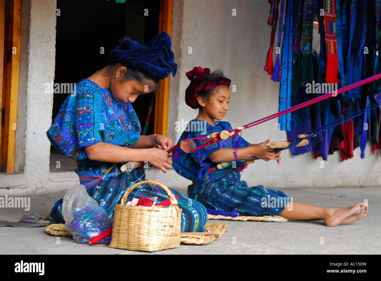 Mayan indigenous children weaving traditional textile, San Antonio