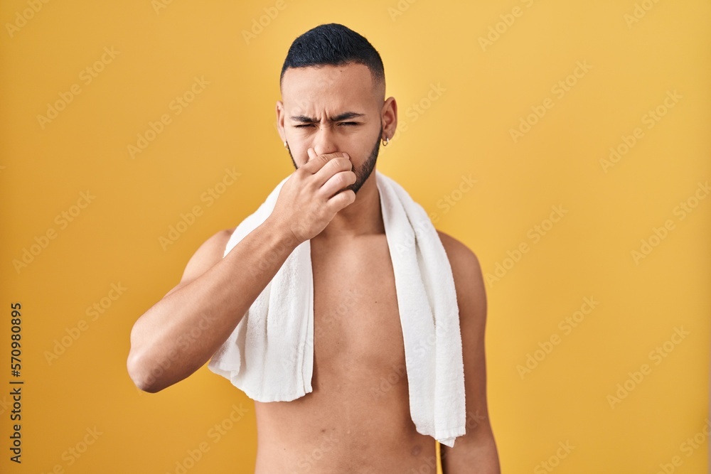 Young hispanic man standing shirtless with towel smelling something stinky and disgusting