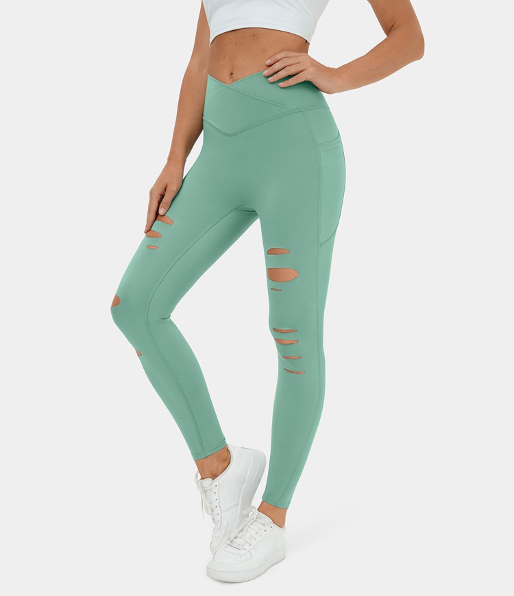Women's High Waisted Crossover Side Pocket Ripped Cut Out Casual 7/8