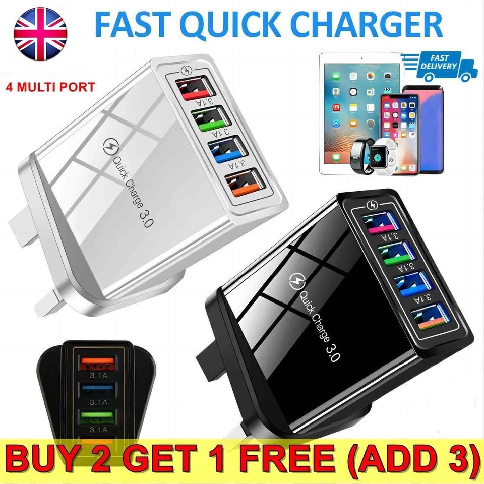 4 MultiPort Fast Quick Charge USB Hub Mains UK / EU Plug Adapter Wall