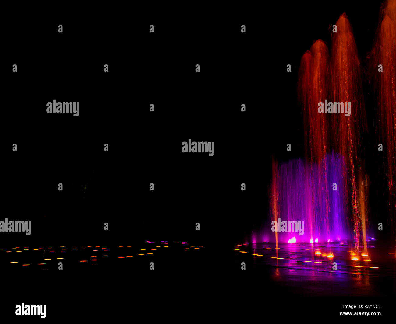 Large multi colored decorative dancing water jet led light fountain show at night Stock Photo