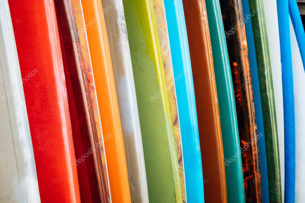 Conjunto de tablas de surf de colores en alquiler en la playa. Tablas