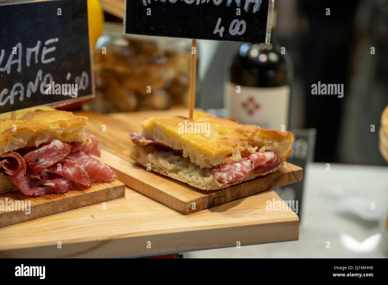 Comida italiana de la calle, sándwiches de jamón de Parma, pan con