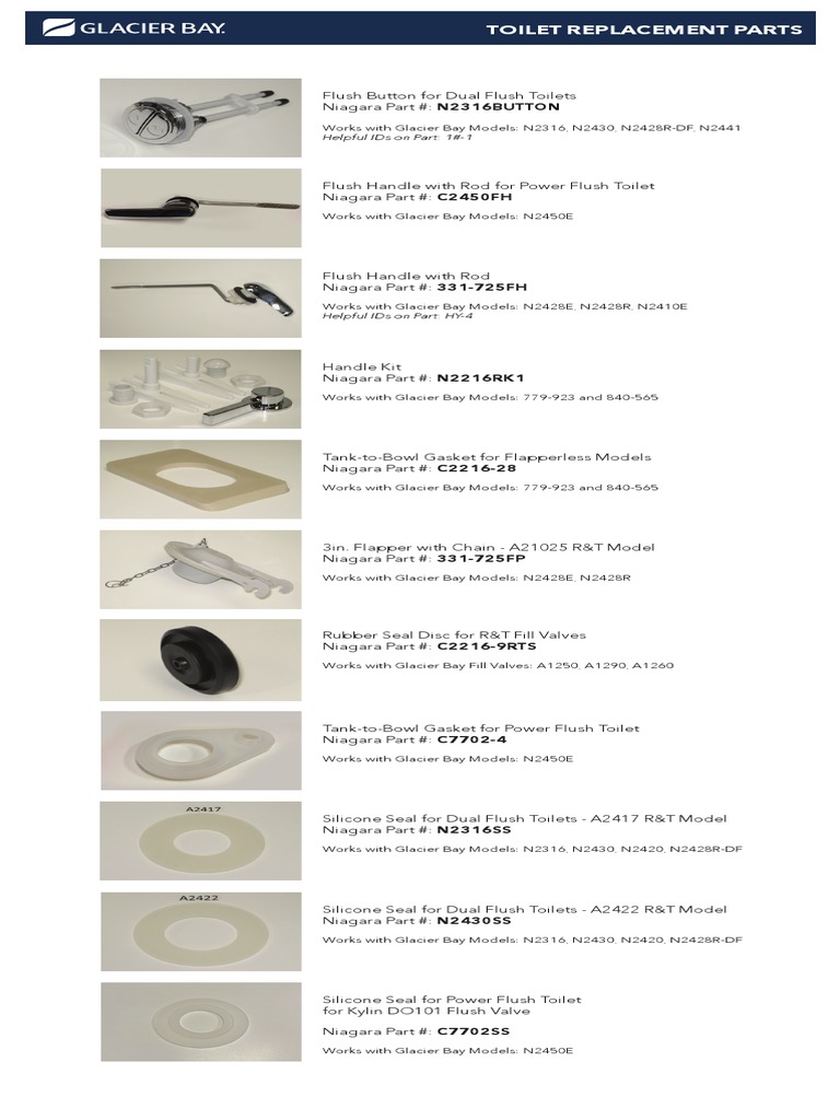 Glacier Bay Top Button 3inch Flush Valve And Fill Valve Kit For Two Glacier Bay Niagara Toilet Parts Works with niagara ecologic/flapperless models: Find your model below for a quick tutorial video on technical support. Have a toilet under warranty that needs a new part? Direct replacement for glacier bay and niagara flapperless toilets; Fluidmaster 703ap4 specialty toilet fill valve for glacier bay and niagara conservation flapperless toilets Glacier Bay Niagara Toilet Parts.