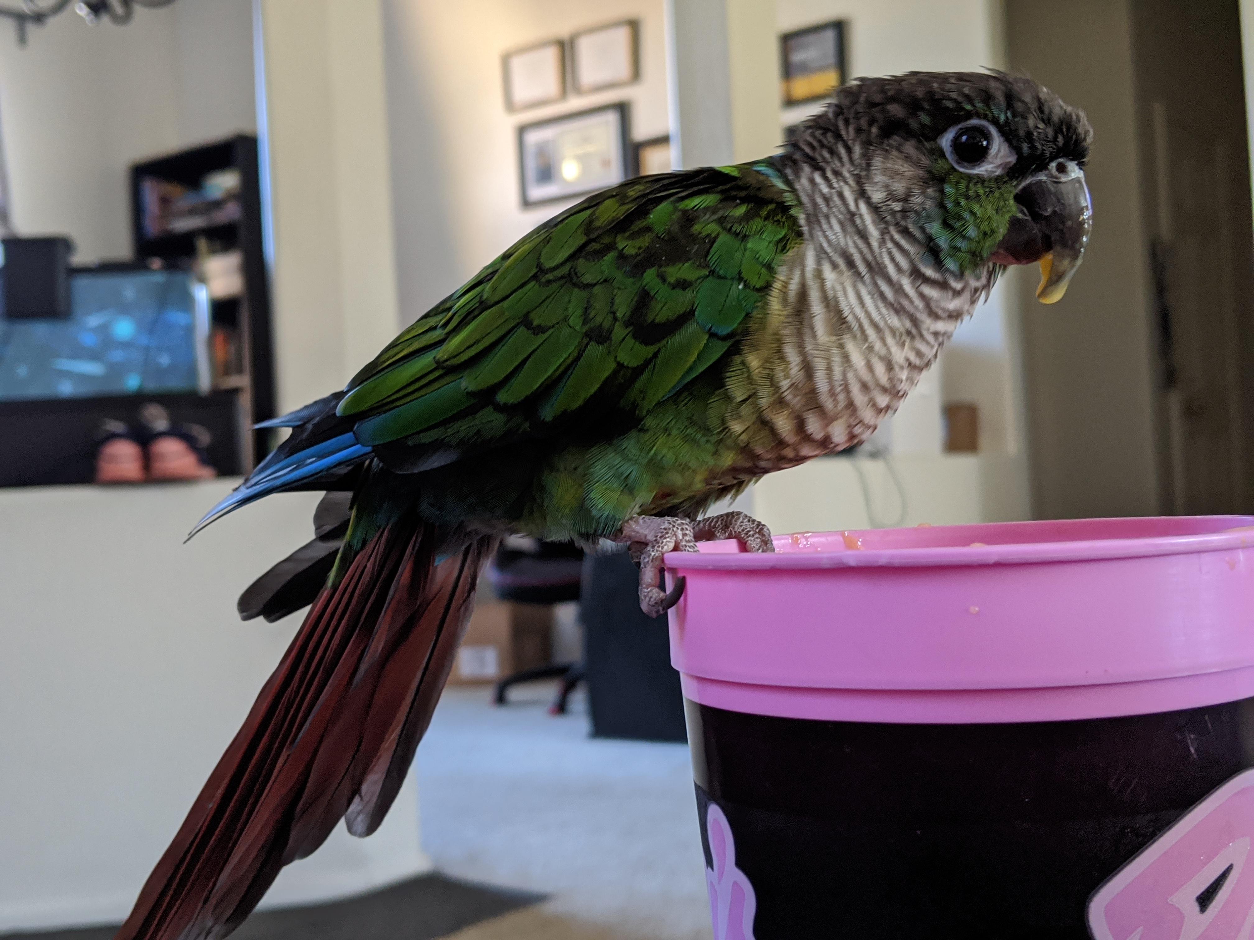 "Your orange juice is my orange juice!" Mango r/Conures
