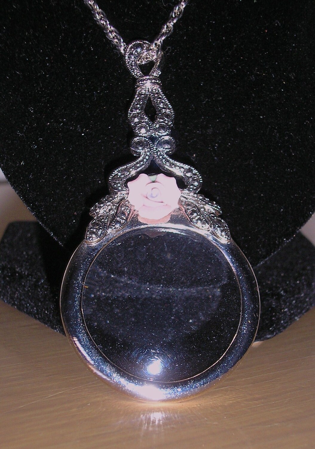 Vintage Magnifying glass pendant with porcelin rose and