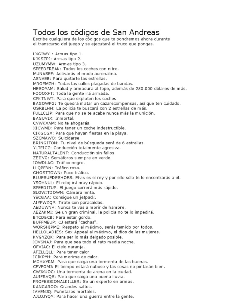 Los trucos de gta san andreas para pc son la forma ideal de disfrutar del juego de rockstar a tope desde una óptica distinta y. Y por si fuera poco, también encontrarás trucos que te permitirán obtener una serie de ventajas increíbles con tu personaje, como munición infinita, personaje inmortal, acceso a áreas restringidas y mucho más. Para empezar te dejo el siguiente video en donde nos muestran algunas claves de gta san andreas pc. También te presentamos otros códigos relacionados con el dinero, los carros, la jugabilidad y el A continuación, los trucos más populares y comunes: Para activar el truco de la vida infinita en la versión de pc de gta san andreas, los jugadores deben seguir los siguientes. Trucos de dinero, salud y armaduras infinitas. Uno de los métodos más efectivos para conseguir vida infinita es utilizar códigos de trucos. simplemente deberás abrir la consola. Consigue todas las armas, hazte con munición y vida infinita, y desata el modo caos en pc con estos trucos de gta san andreas. Para usar códigos na versão pc de.