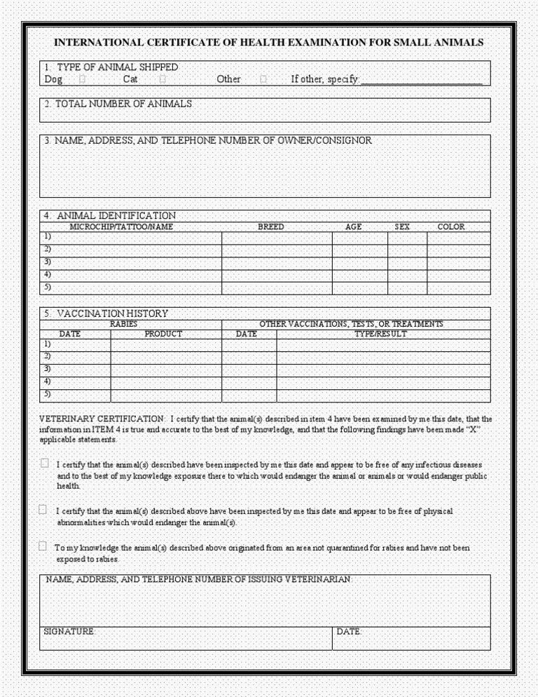 Fillable Online Small Animal Health Certificate Information Fax Email Animal Health Certificate Document Animal quarantine officer inspects the health certificate, physically checks the animal and issues the import quarantine certificate. Getting an animal health certificate. Please check your dog's or cat's entry conditions of the destination country with the embassy or animal quarantine authorities. It certifies that your pet meets the health and vaccination requirements of. Eu animal health certificate an eu animal. Animal Health Certificate Document.